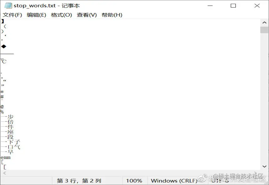 这里主要讲解停用词过滤,将这些出现频率高却不影响文本主题的停用词删除。在Jieb分词过程中引入stop_words.txt停用词词典,如果存在则过滤即可。