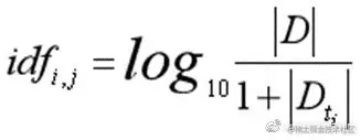 倒文档频率(Inverse Document Frequency,简称IDF)是Spark Jones在1972年提出的,用于计算词与文献相关权重的经典方法。计算公式如下,参数|D|表示语料的文本总数,|Dt| 表示文本所包含特征词 tj 的数量。