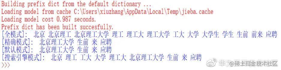 上述代码输出如下,包括全模式、精确模式和搜索引擎模式输出的结果。