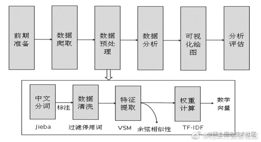 在数据分析和数据挖掘中,通常需要经历前期准备、数据爬取、数据预处理、数据分析、数据可视化、评估分析等步骤,而数据分析之前的工作几乎要花费数据工程师近一半的工作时间,其中的数据预处理也将直接影响后续模型分析的好坏。图是数据预处理的基本步骤,包括中文分词、词性标注、数据清洗、特征提取(向量空间模型存储)、权重计算(TF-IDF)等。