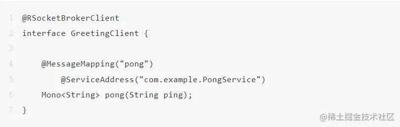 接下来我们还需要写一个RSocket服务,这个就是标准的Spring RSocket,代码如下: