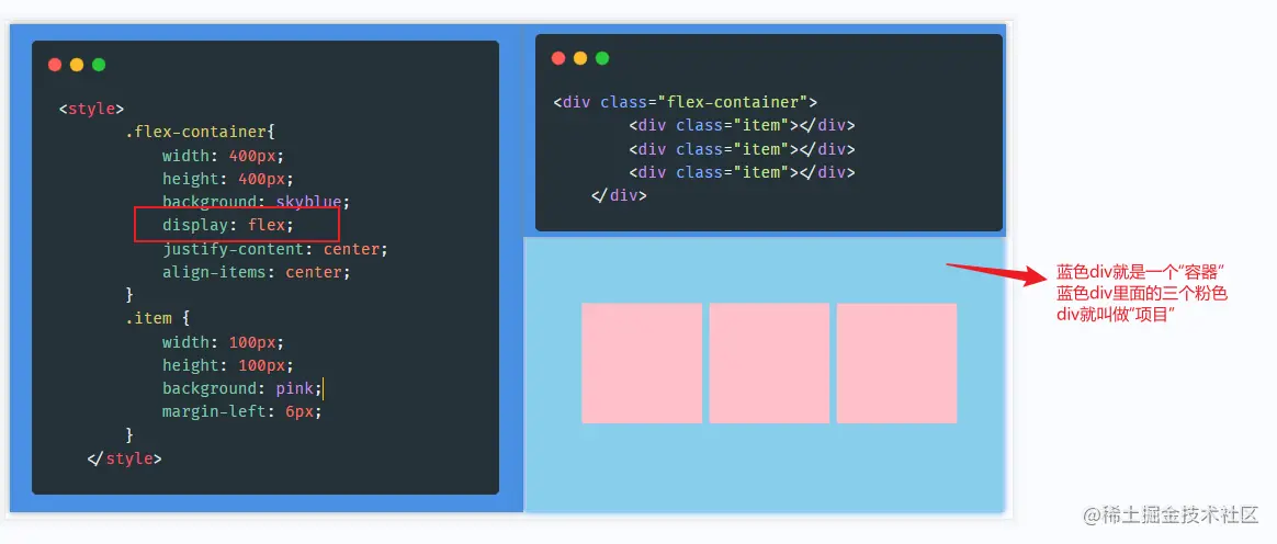 从上图可以看出来,只要给元素设置了display:flex,该元素就变成一个“容器”,而该元素的子元素则变成了“项目”。