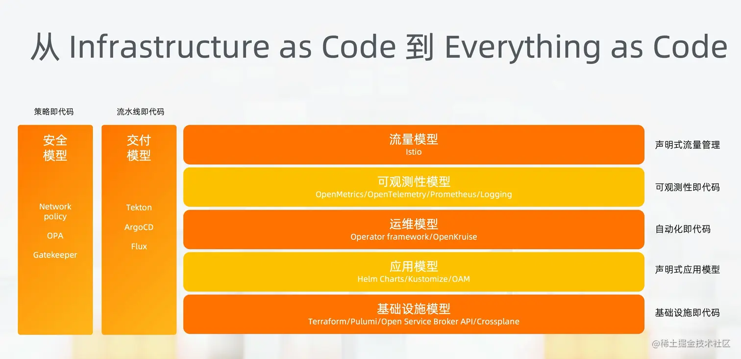 将 IaC 概念进行延伸,可以覆盖整个云原生软件的交付、运维流程,即 Everything as Code。本图列出来云原生应用涉及的各种模型,从基础设施、到应用定义、到应用交付管理和安全体系,我们都可以通过声明式方式对应用的配置进行管理。