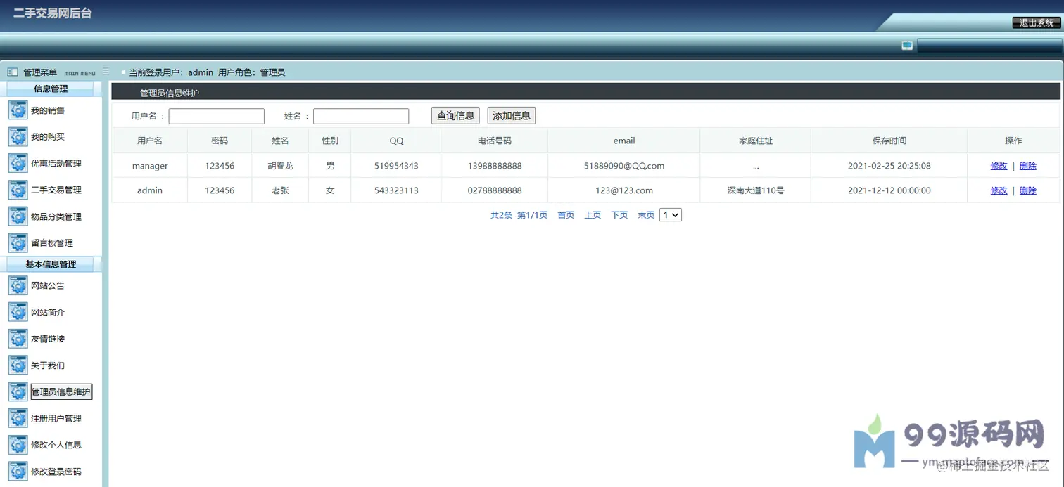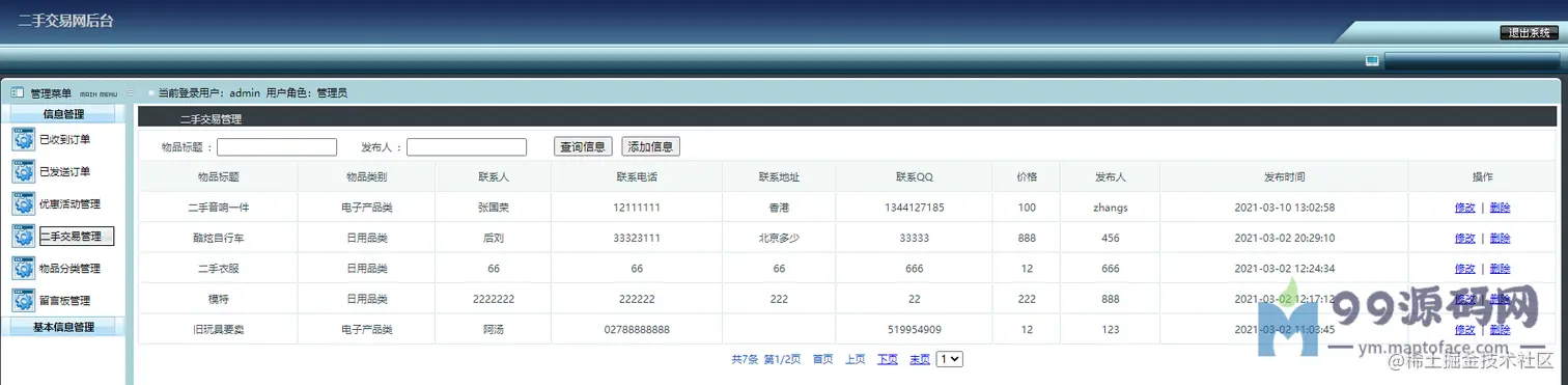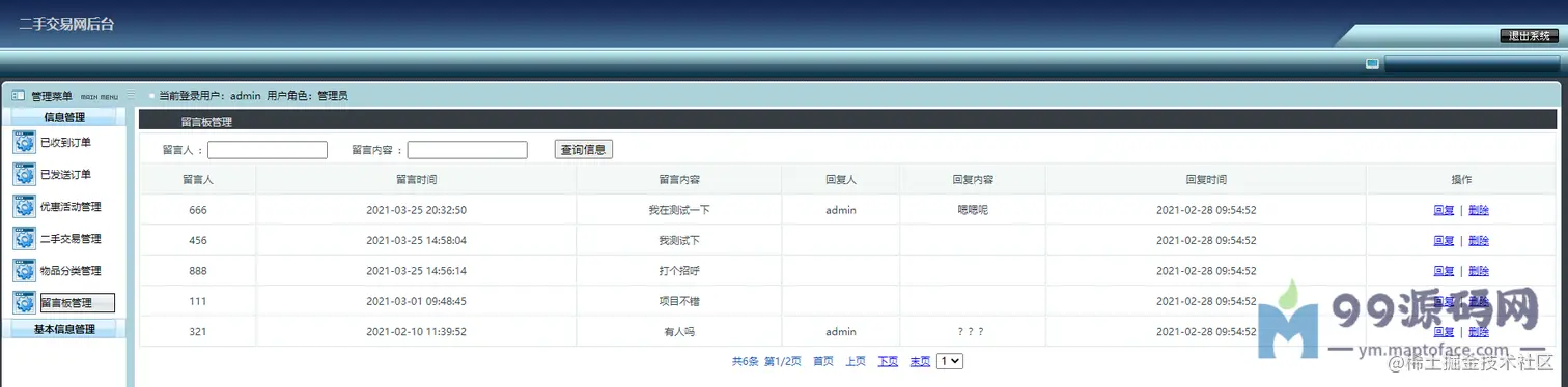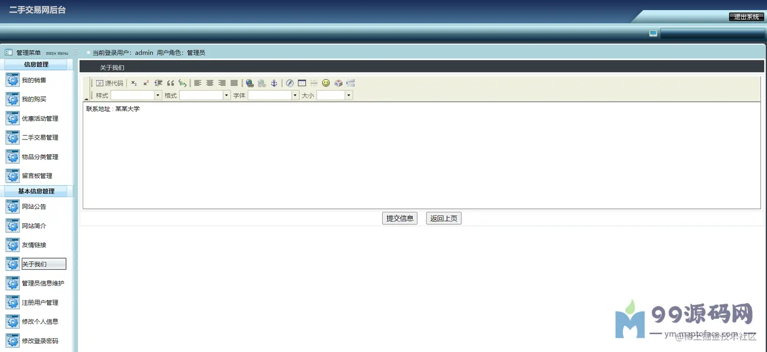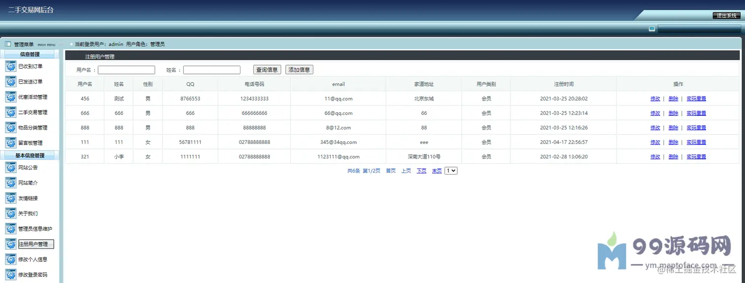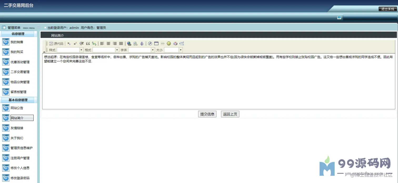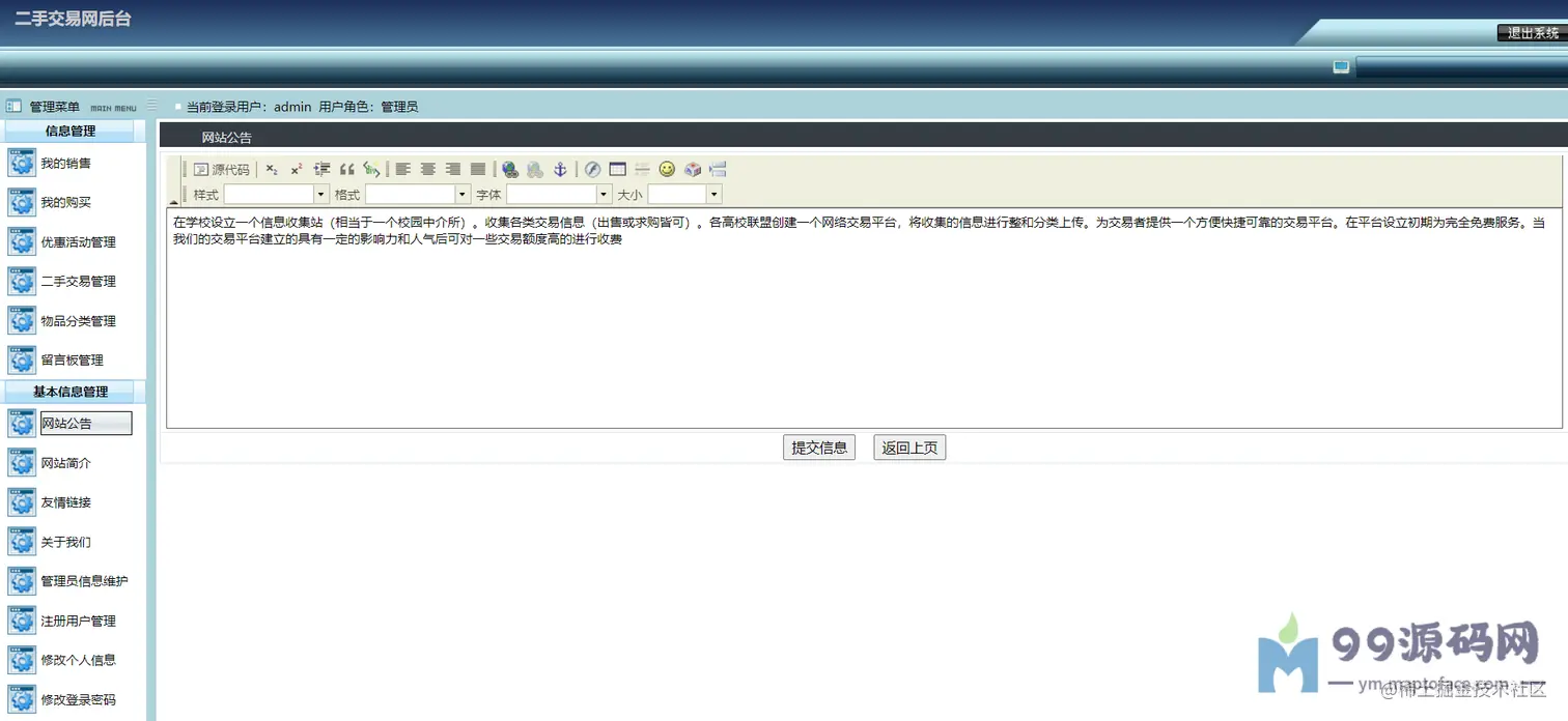 可以对交易进行监管,比如求购管理(已受订单)、购买管理(已发订单)、优惠活动管理、 二手物品管理、物品分类管理、留言管理、网站公告简介友链管理、 管理员管理、注册用户管理(密码重置)、修改个人信息、密码