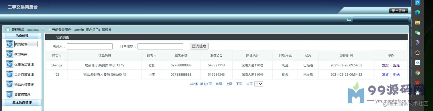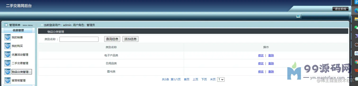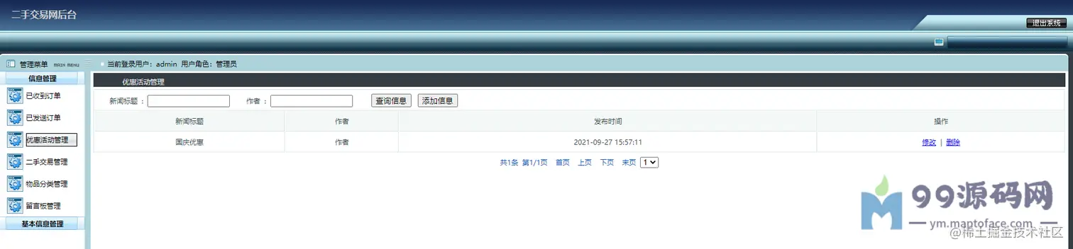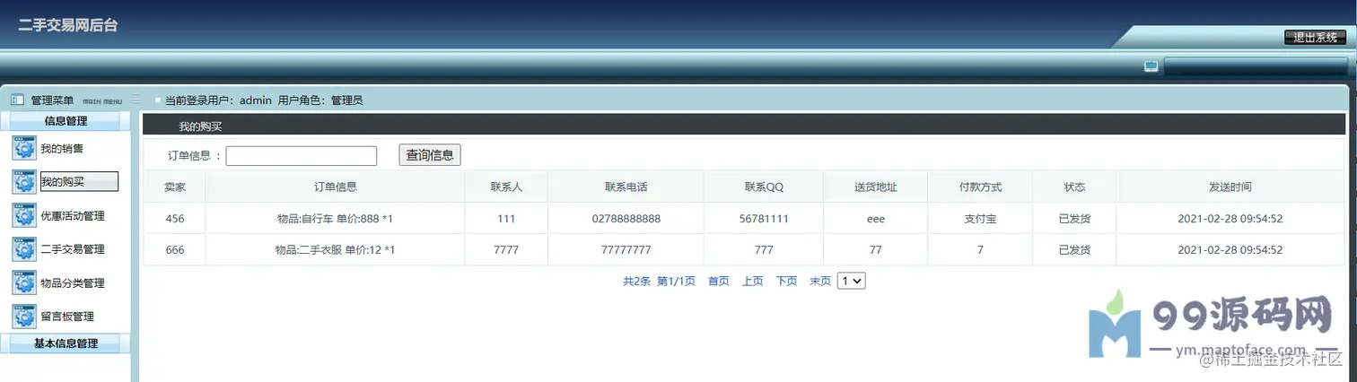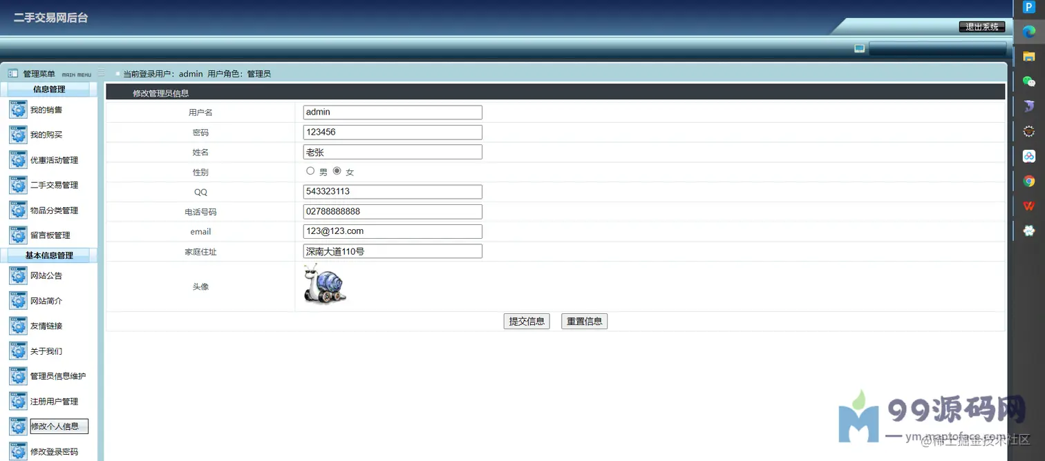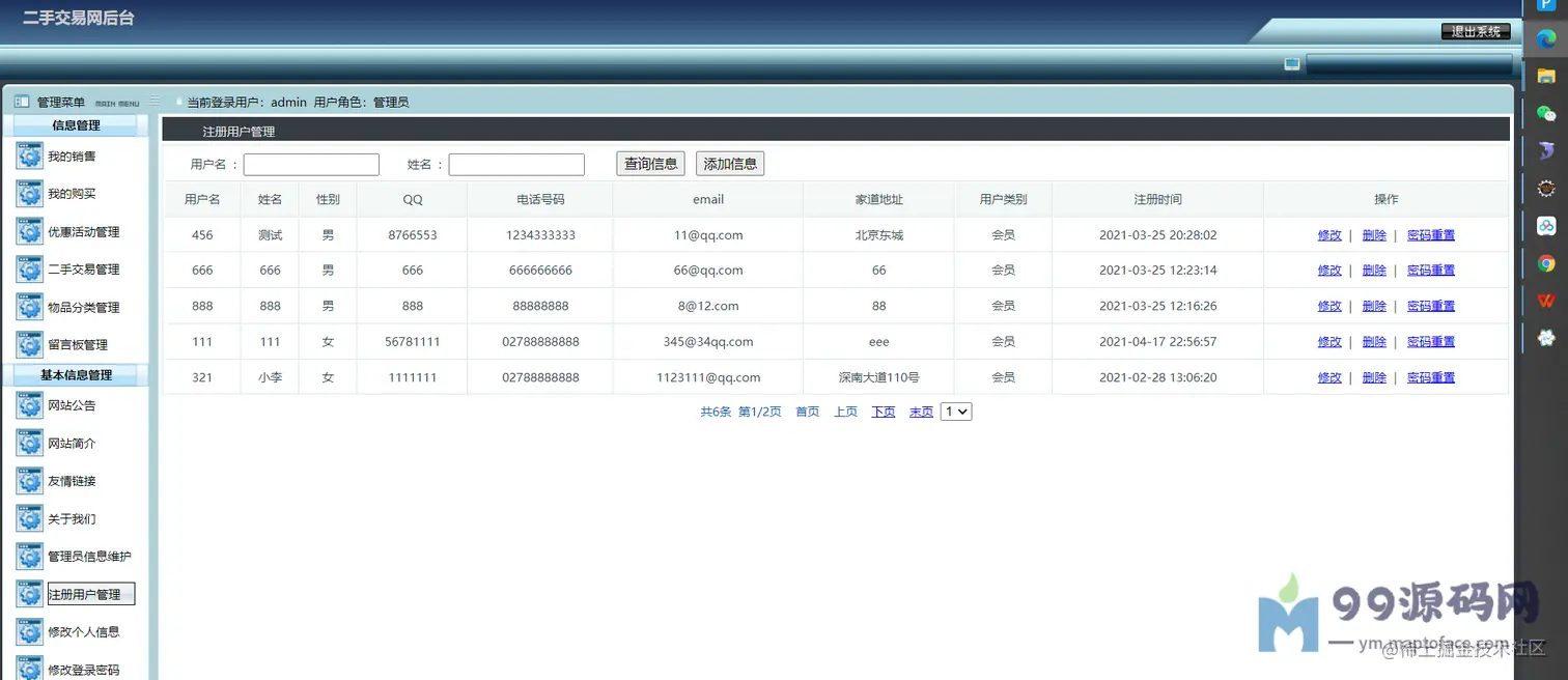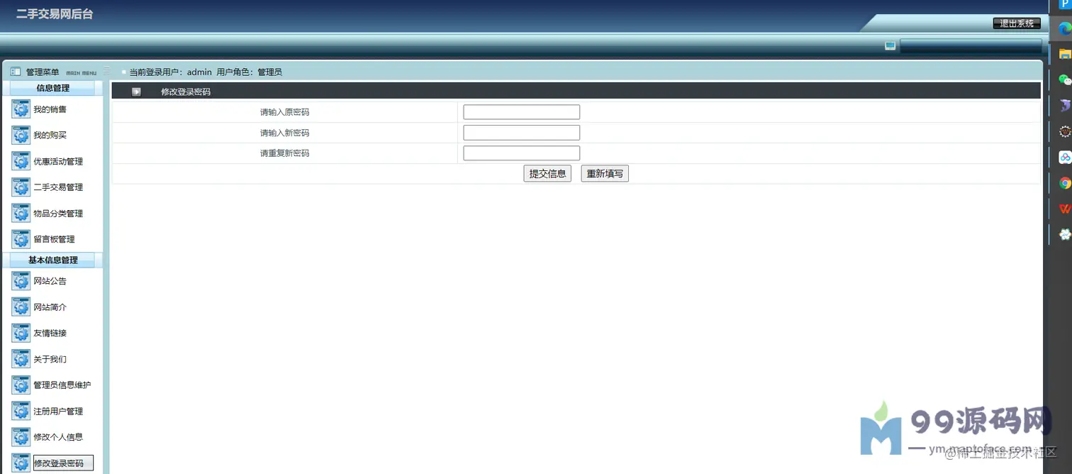 可以对交易进行监管,比如求购管理(已受订单)、购买管理(已发订单)、优惠活动管理、 二手物品管理、物品分类管理、留言管理、网站公告简介友链管理、 管理员管理、注册用户管理(密码重置)、修改个人信息、密码