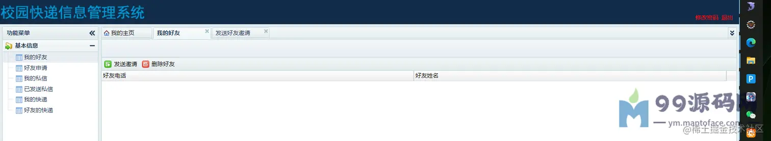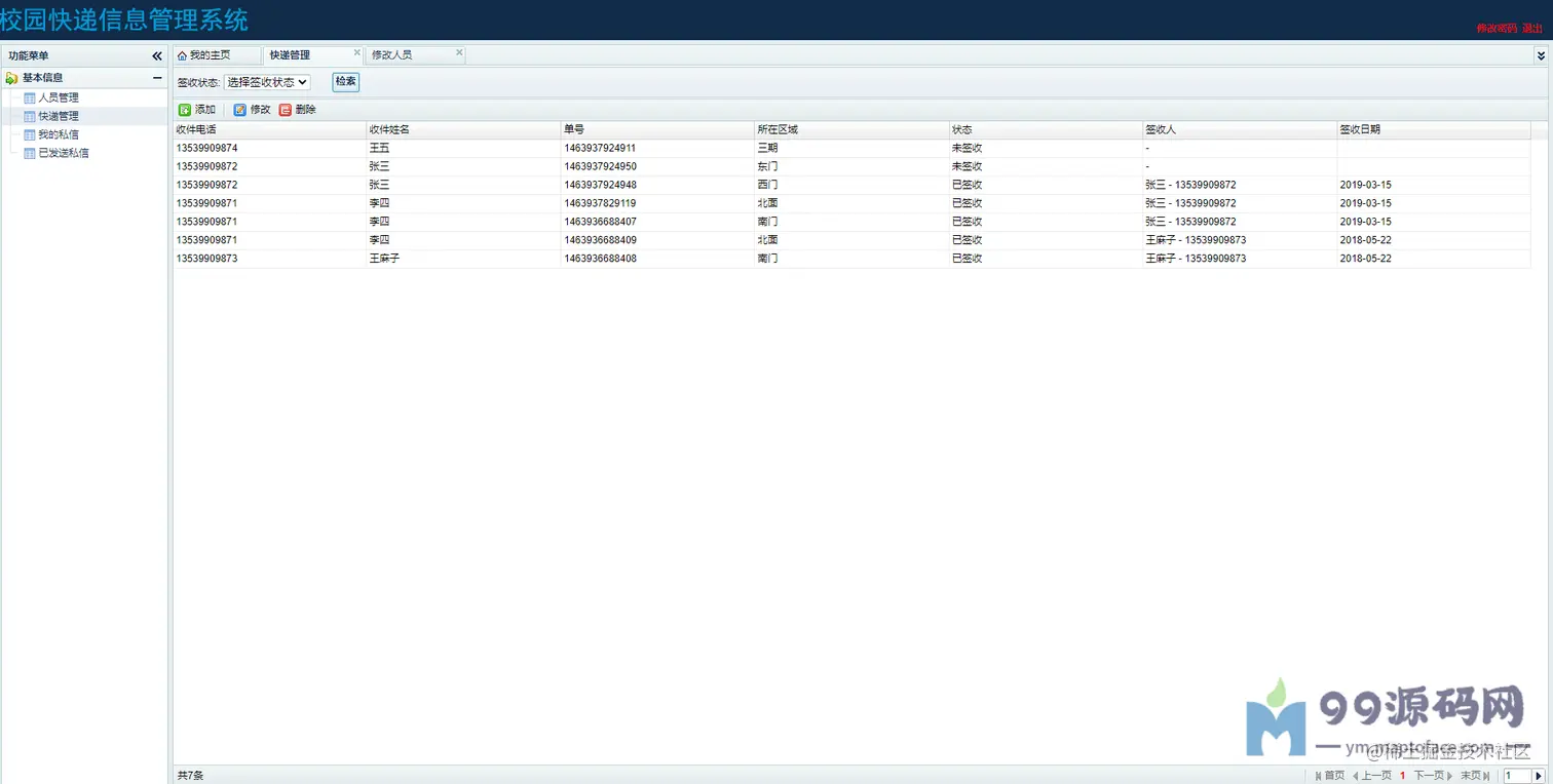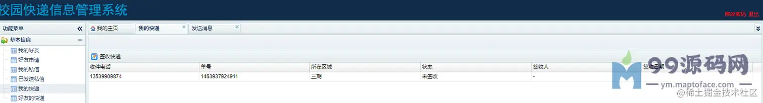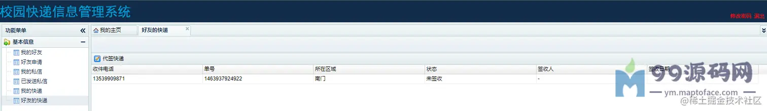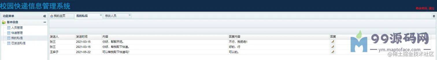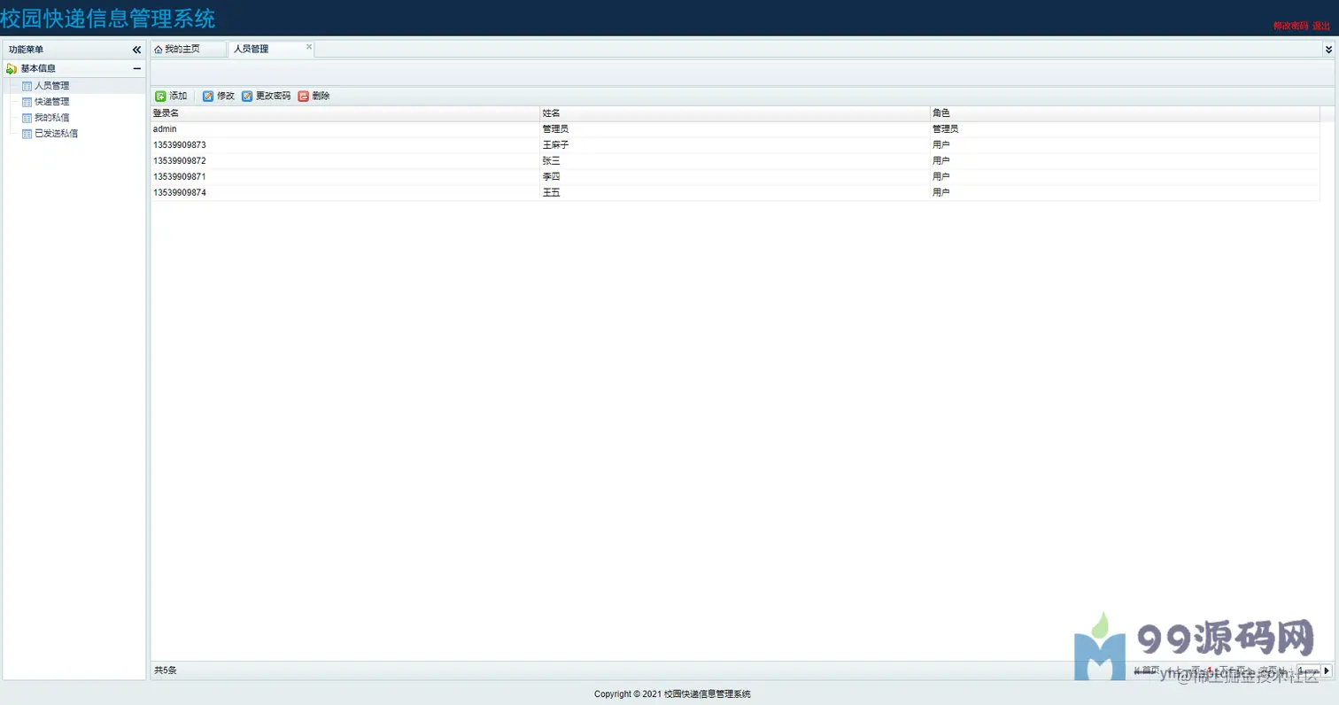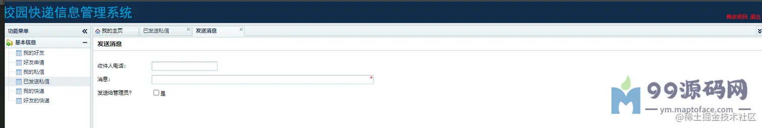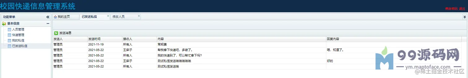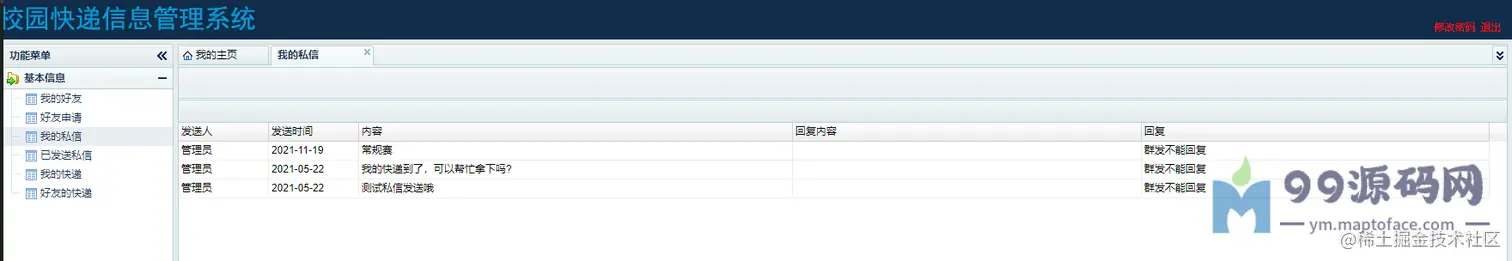 管理员:可以进行用户管理、可以进行快递管理、查看我的私信、查看我发送的私信。