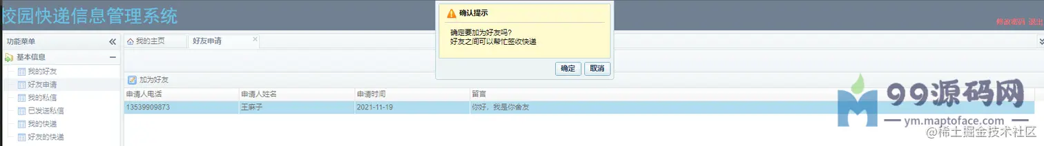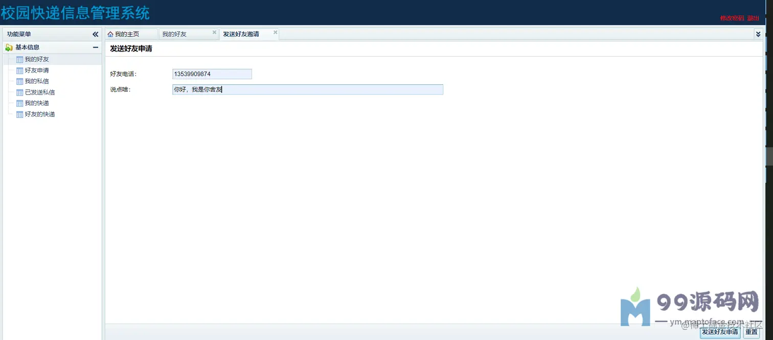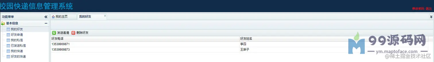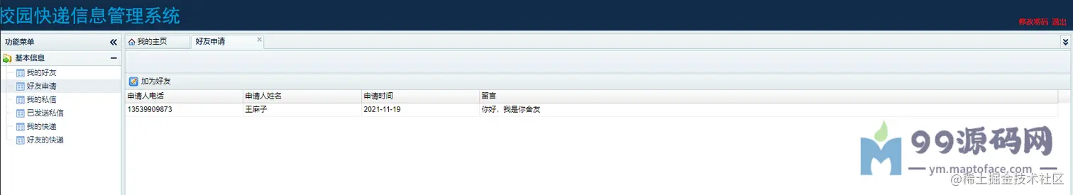 学生:可以查看我的好友,可以发送好友邀请给其他用户,删除好友;可以查看好友申请,同意好友申请, 加为好友;可以查看其他用户给我发送的私信并回复;可以查看我发送的私信;可以查看我的快递并签收;可以看到好友的快递(必须是好友)并代签。