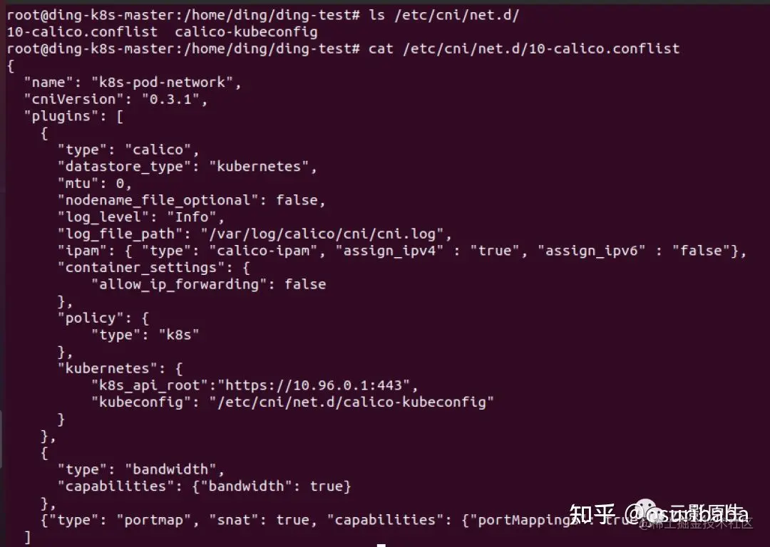 比如我手边集群上的网络插件使用的是 calico,我们就可以在 /etc/cni/net.d 目录下看到其对应的配置文件: