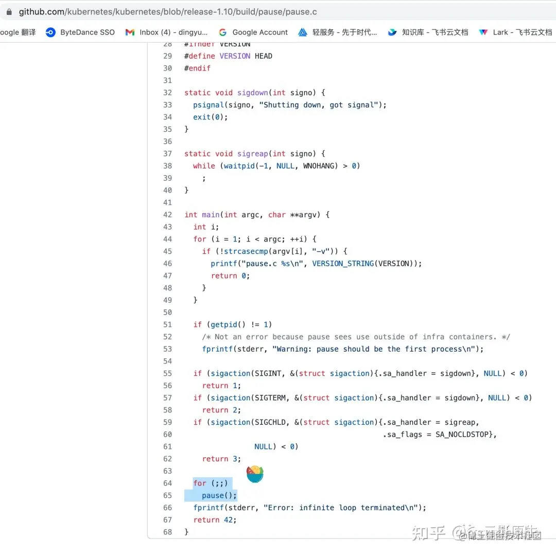那么回到上面说的 sandbox,其实 sandbox 就是刚刚所说的网络资源以及存储资源的承载。我们可以简单地把它理解成,这个 sandbox 就是一个容器,它在 k8s 里被叫做 "pause",我们可以简单看下 k8s 默认的 pause 容器是啥: