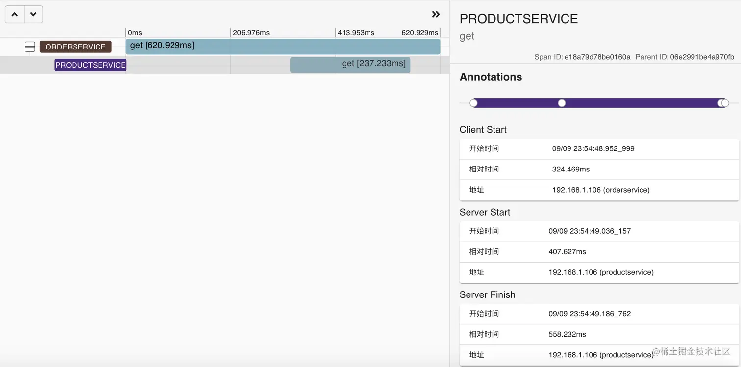 启动这两个项目,调用OrderApi的getdetails接口,完成后打开zipkin界面点击进去可查看链路详情
