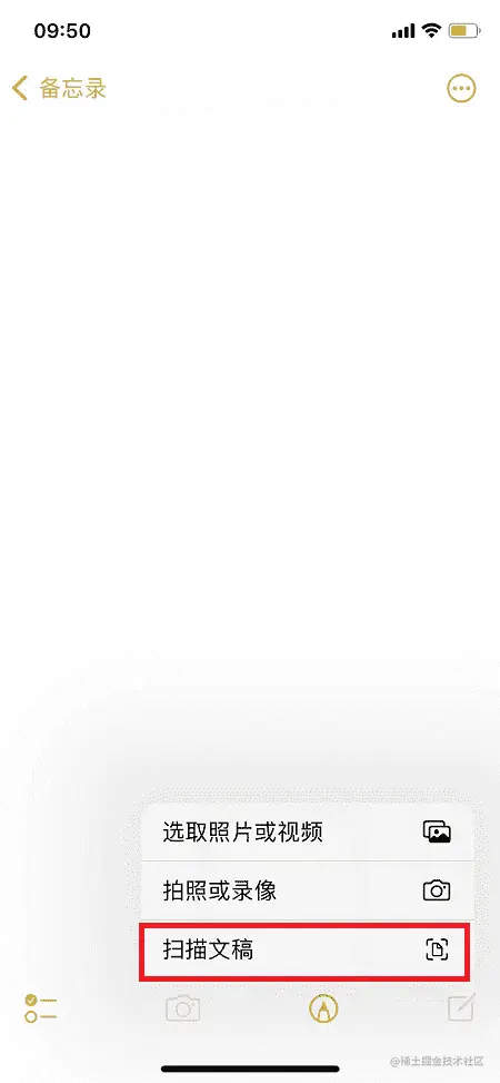 第二步:新建一个备忘录后打开【扫描文稿】。