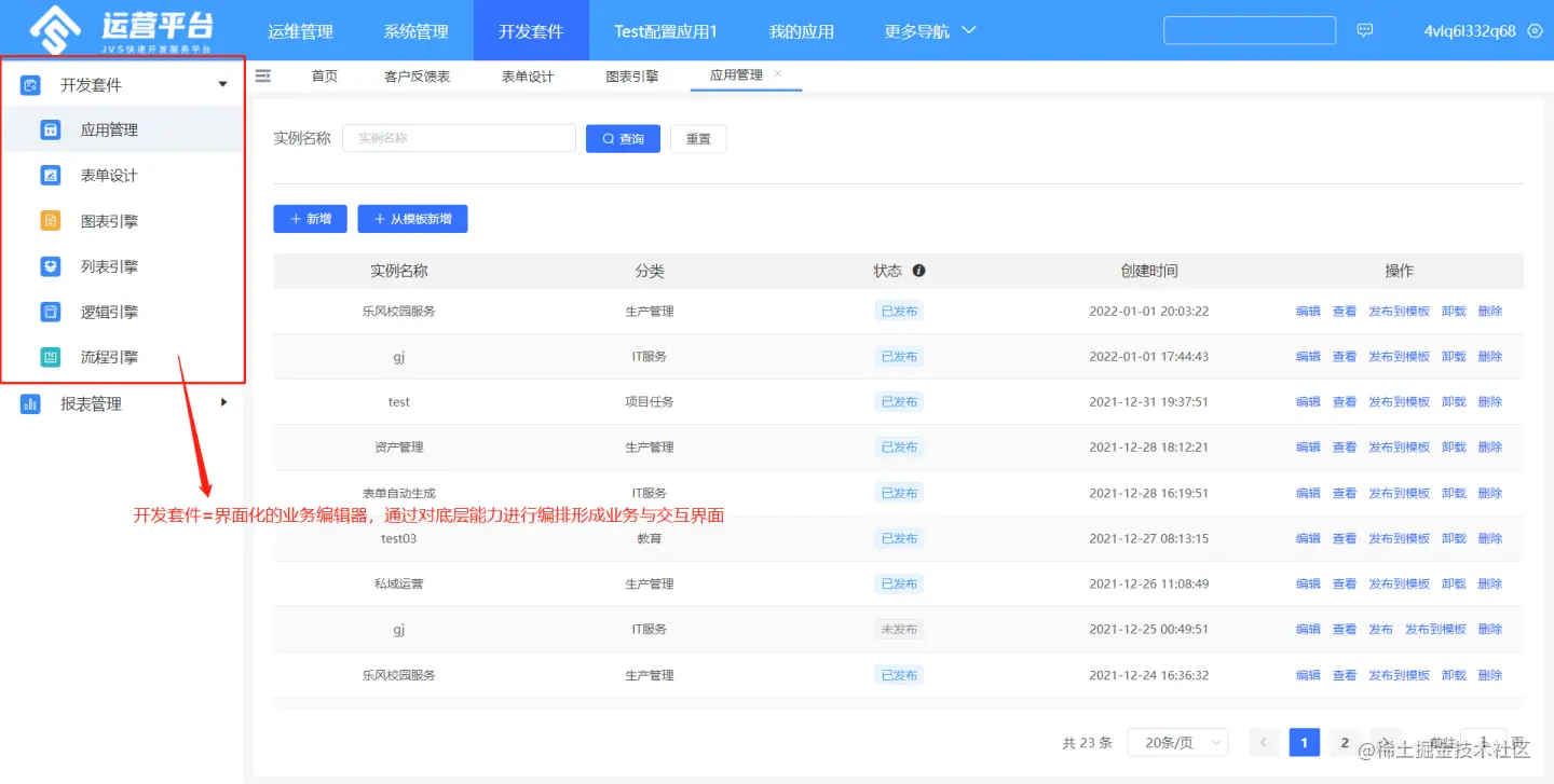 对于轻应用,俗称低代码应用,开发套件=界面化的业务编辑器,通过对底层提供的标准组件进行编排,形成业务逻辑与交互界面。