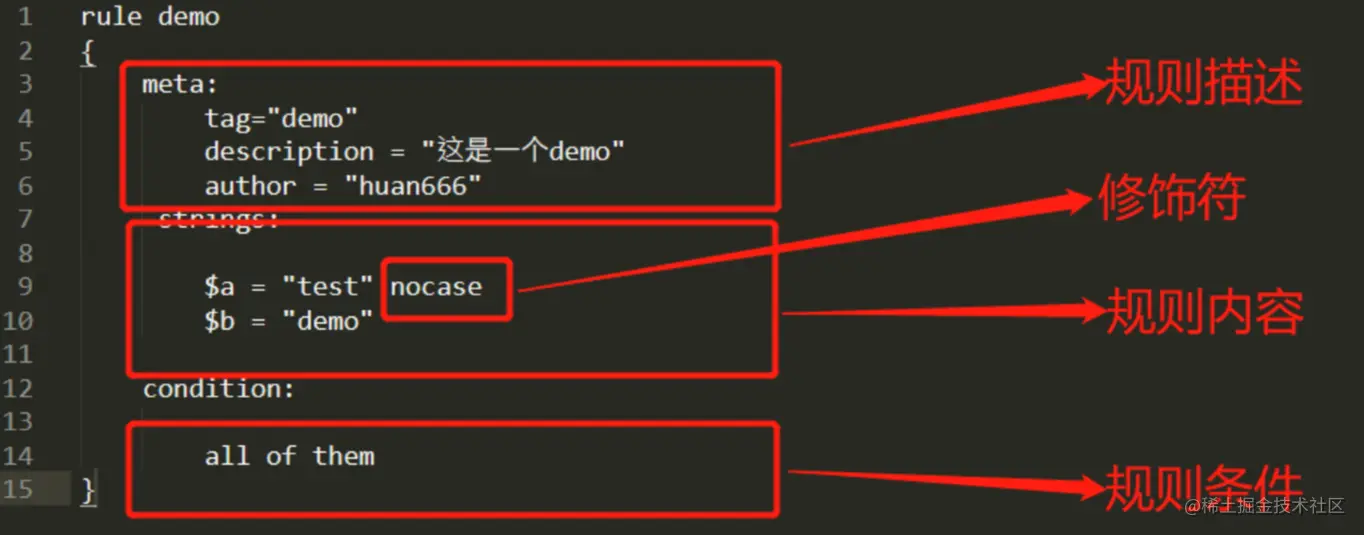1.Yara规则内容支持字符串、正则表达式、十六进制进行匹配。