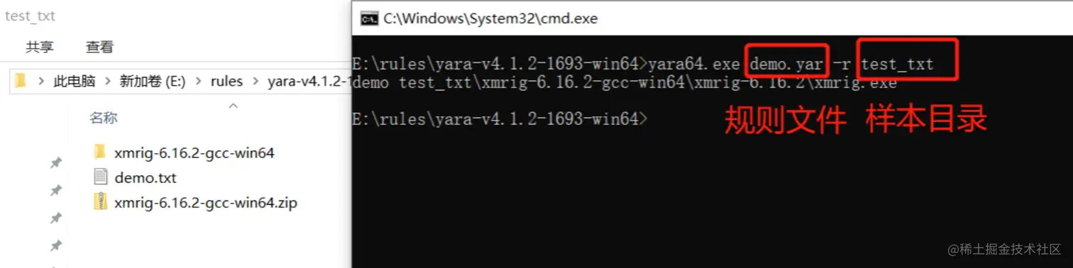 3、xmrig挖矿程序扫描,利用-r参数对目录下的文件进行递归扫描,可发现利用检测规则扫描出xmrig.exe挖矿程序。