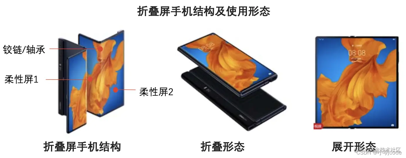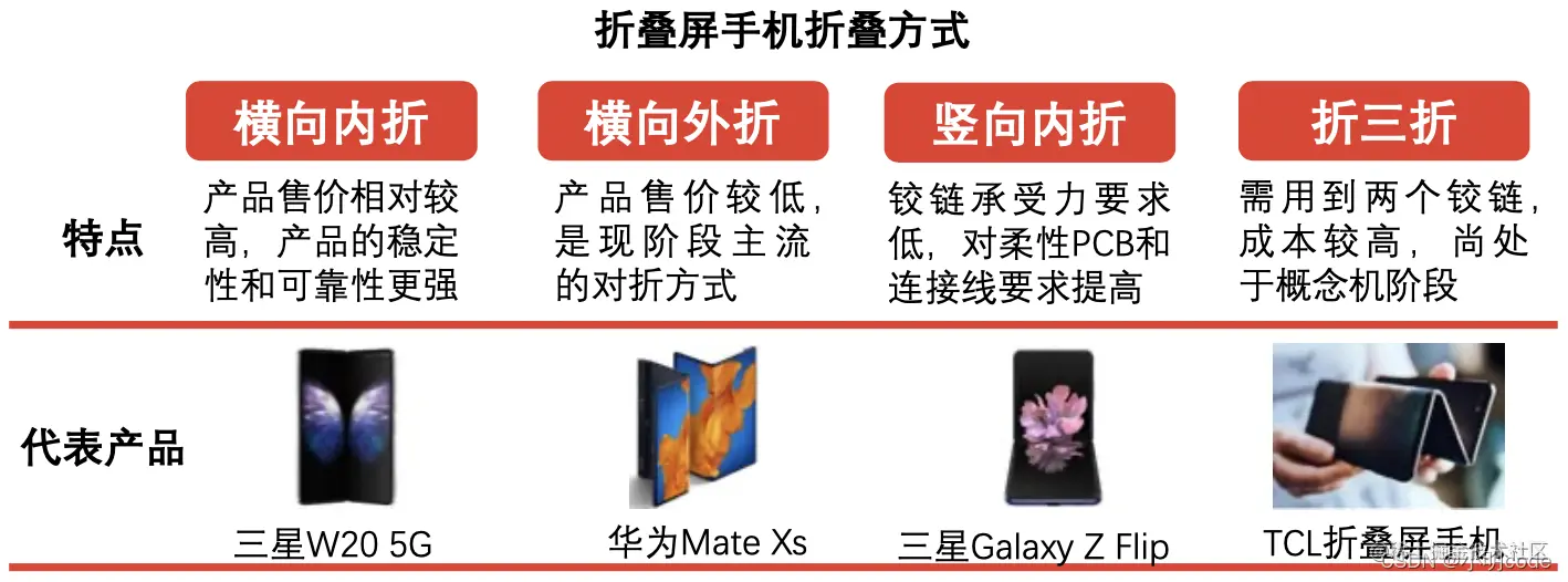 - 横向内折:折弯半径小,需使用寿命更高的柔性屏幕,因此实现难度大、技术成本更高。但优点是折叠状态下,屏幕被折合在内侧,可较好保护屏幕。代表产品有:三星Galaxy Fold 和 W20 5G、华为Mate X2、小米MIX Fold;