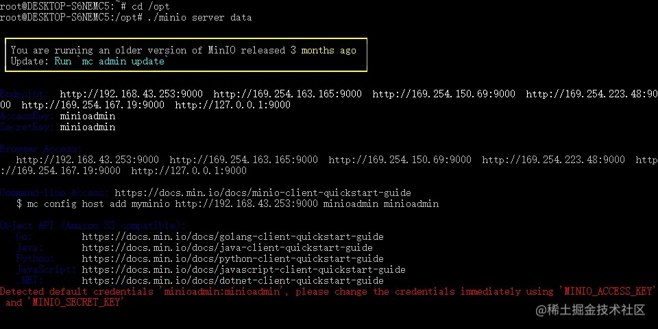 参照官方文档docs.minio.org.cn/docs/,将minio可执行文件下载下来,放到/opt目录下(版本为20201028,minio的更新非常快)。执行以下命令:
