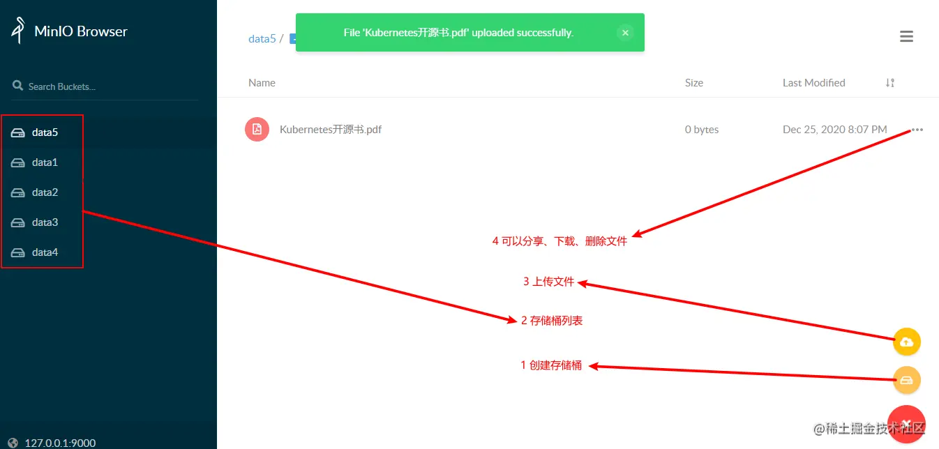 minio浏览器端使用界面,minio提供的管理功能如图所示,主要包括创建存储桶和文件上传、下载、分享、删除操作。值得一提的是minio的文件分享和百度云的分享类似,可以设置分享链接的有效期(视自己的应用场景使用)。