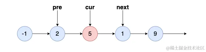 发现 cur 正是我们需要查找的 5 ,那么记录下 5 的下一个节点 1 ,也就是next: