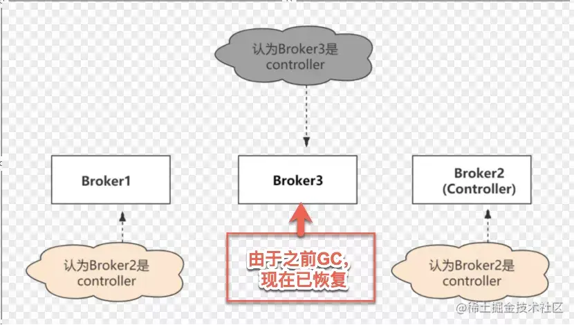 其实这种情况是很容易发生的。例如,由于垃圾回收(GC),一个Controller被认为是死的,并选择了一个新的控制器。在GC的情况下,在原Controller眼里没有任何变化,Broker甚至不知道自己已经被暂停了。因此,它将继续充当当前Controller,这在分布式系统中很常见,称为裂脑。