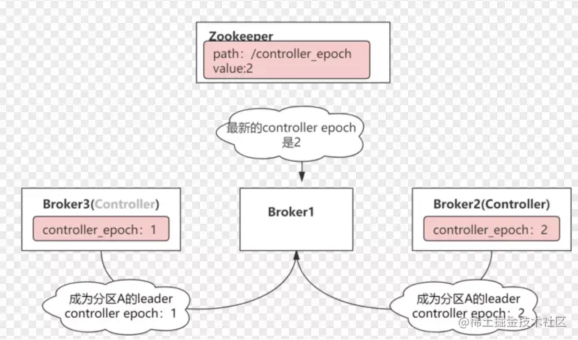 每个新选择的Controller通过zookeeper的条件递增操作获得一个新的更大的epoch number。当其他Broker知道当前的epoch number时,如果他们从Controller收到包含旧(较小)epoch number的消息,则它们将被忽略。即Broker根据最大的epoch number来区分最新的Controller。