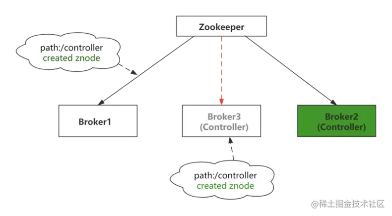 最先在Zookeeper上创建临时节点/controller成功的Broker就是Controller。