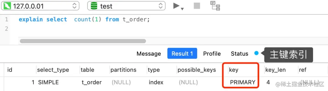 执行 explain 命令效率是很高的,因为它并不会真正的去查询,下图中的 rows 字段值就是 explain 命令对表 t_order 记录的估算值。