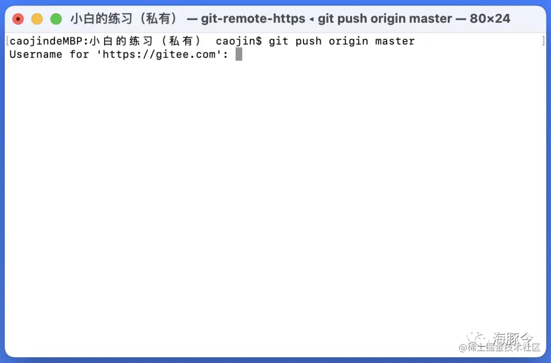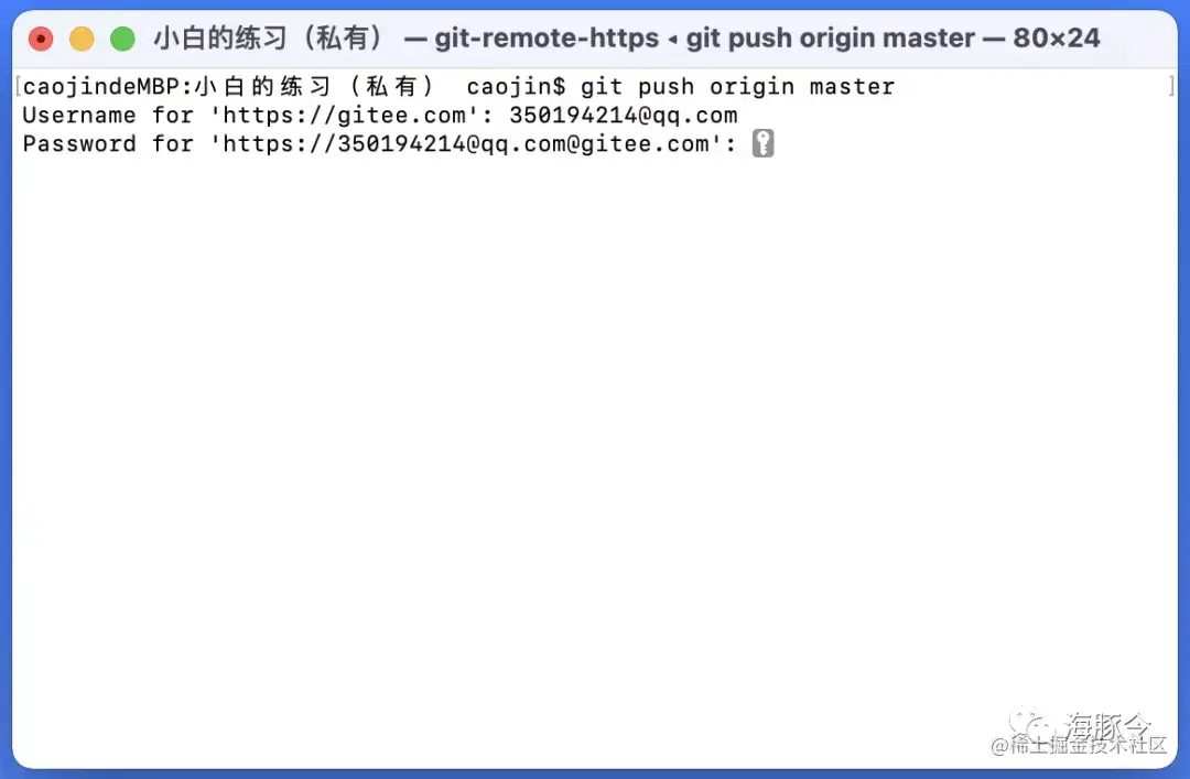 如下图,我正在执行push操作,然后被提示输入用户名密码。对于“码云”来说,登陆的用户名密码就是仓库的用户名密码啦(有些平台可能需要自己单独配置)。