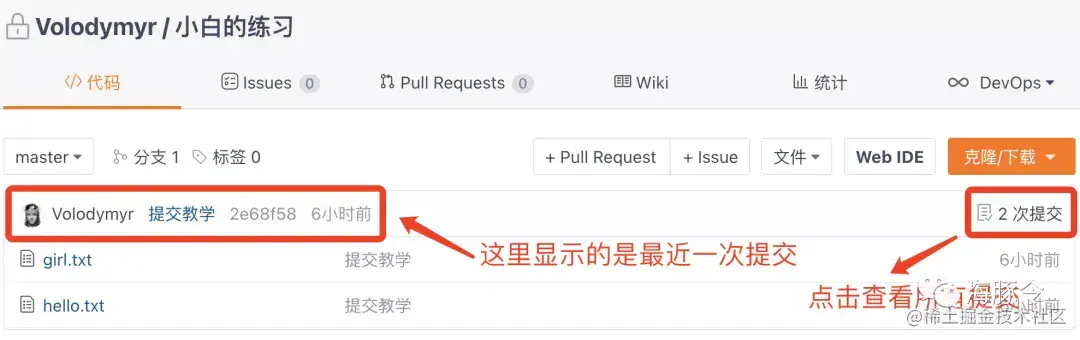 如下图所示,打开“码云”上项目主页,就能查看到你的这次提交啦。