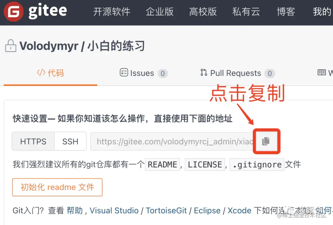 3. 创建完成后,将跳转至下图页面,点击标记处复制仓库地址以备后用。