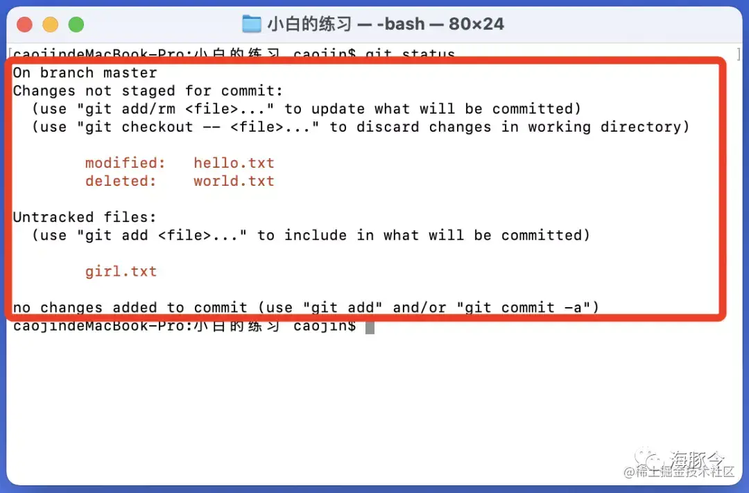 执行完的结果大概长成下图框选处所示。其中,红色的字体部分展示了所有你修改了的项目文件(包含删除的文件和增加的文件)。