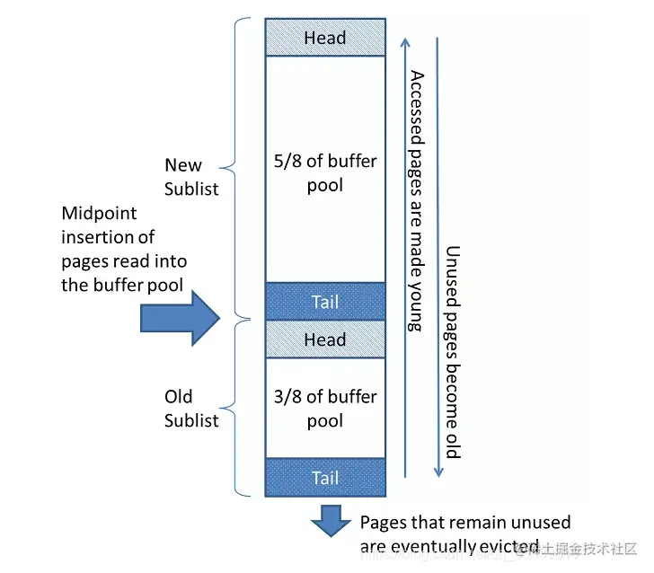 InnoDB按5:3比例把链表分成New区和Old区。图中LRU_old指向的就是old区域的第一个位置,是整个链表的5/8处。即靠近链表头部的5/8是New区域,靠近链表尾部的3/8是old区域。