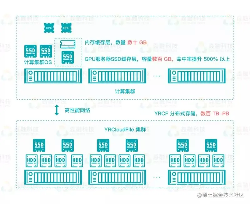 - 内存缓存 + GPU 服务器 SSD 缓存:在 GPU 服务器上,YRCloudFile 可配置一定容量的 SSD 缓存,实现训练程序优先从客户端内存缓存中加载;