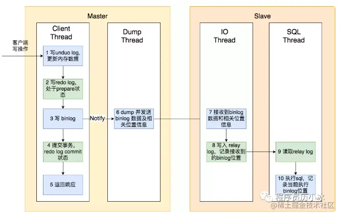 MySQL 主从复制,涉及主从两个节点,一共四个四个线程参与其中: