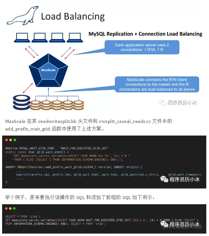 MariaDB 的 MaxScale 就是使用该方案,MaxScale 是 MariaDB 开发的一个数据库智能代理服务(也支持 MySQL),允许根据数据库 SQL 语句将请求转向目标一个到多个服务器,可设定各种复杂程度的转向规则。
