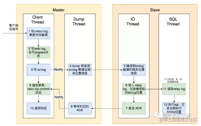 •主节点的 Dump Thread 收到这个 ack 以后,再通知 Client Thread ,此时才能给客户端返回执行成功的响应。