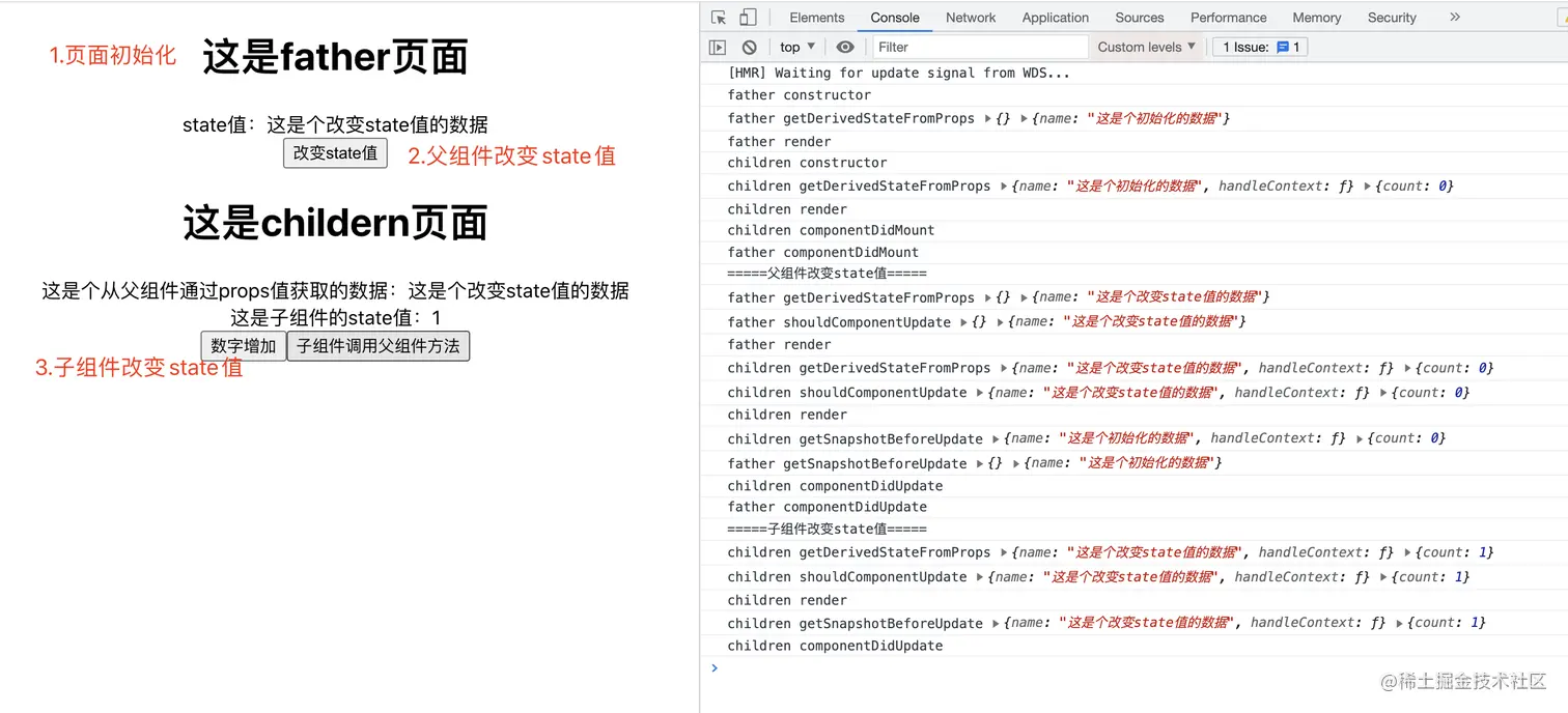 - getDerivedStateFromProps()会在调用 render 方法之前调用,并且在初始挂载及后续更新时都会被调用。它应返回一个对象来更新 state,如果返回 null 则不更新任何内容。