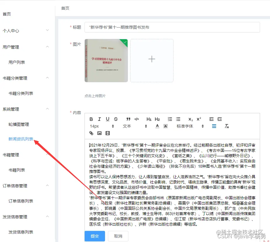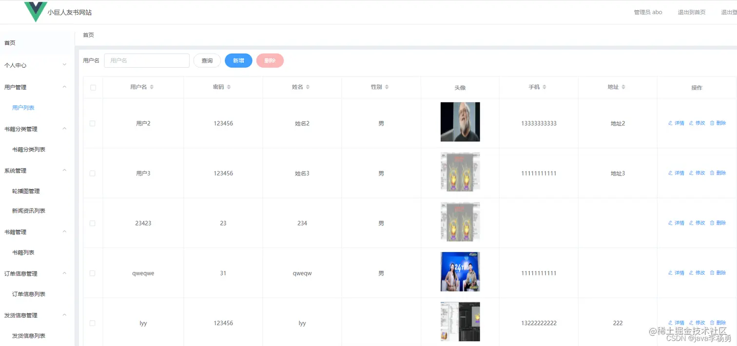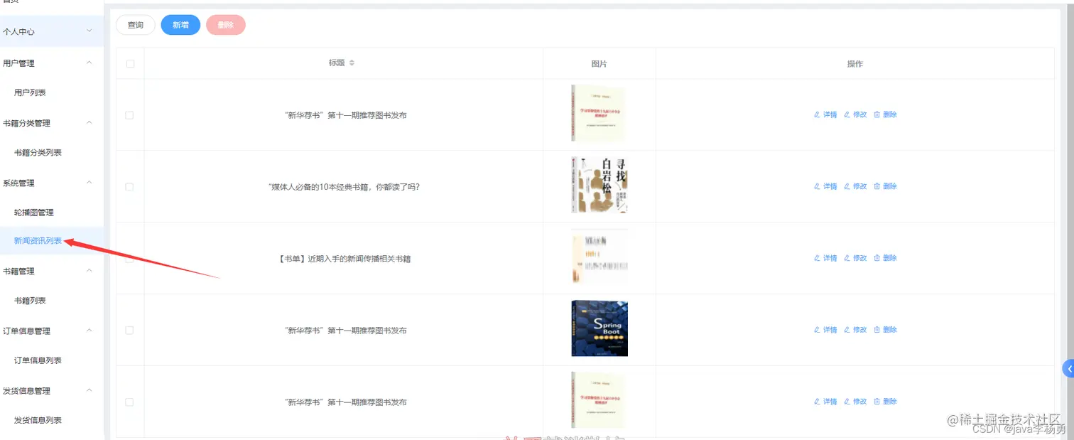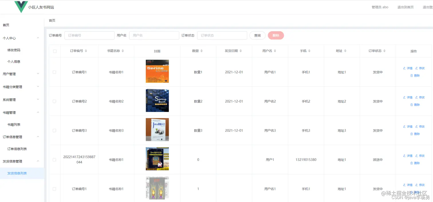 管理员首页:图书商城系统管理员登录后主要有如下功能模块:用户个人信息管理、修改密码、图书分类管理、图书商品详情管理、首页轮播图管理、新闻资讯管理、书籍列表管理、订单信息管理和发货信息管理等。