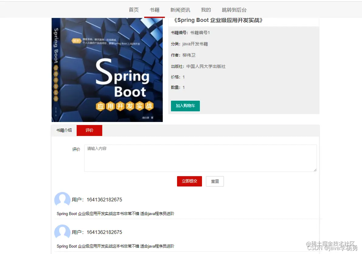 书籍详情页:查看书籍详情信息、可以加入购物车和收藏等查看、也可以查看用户评论信息等