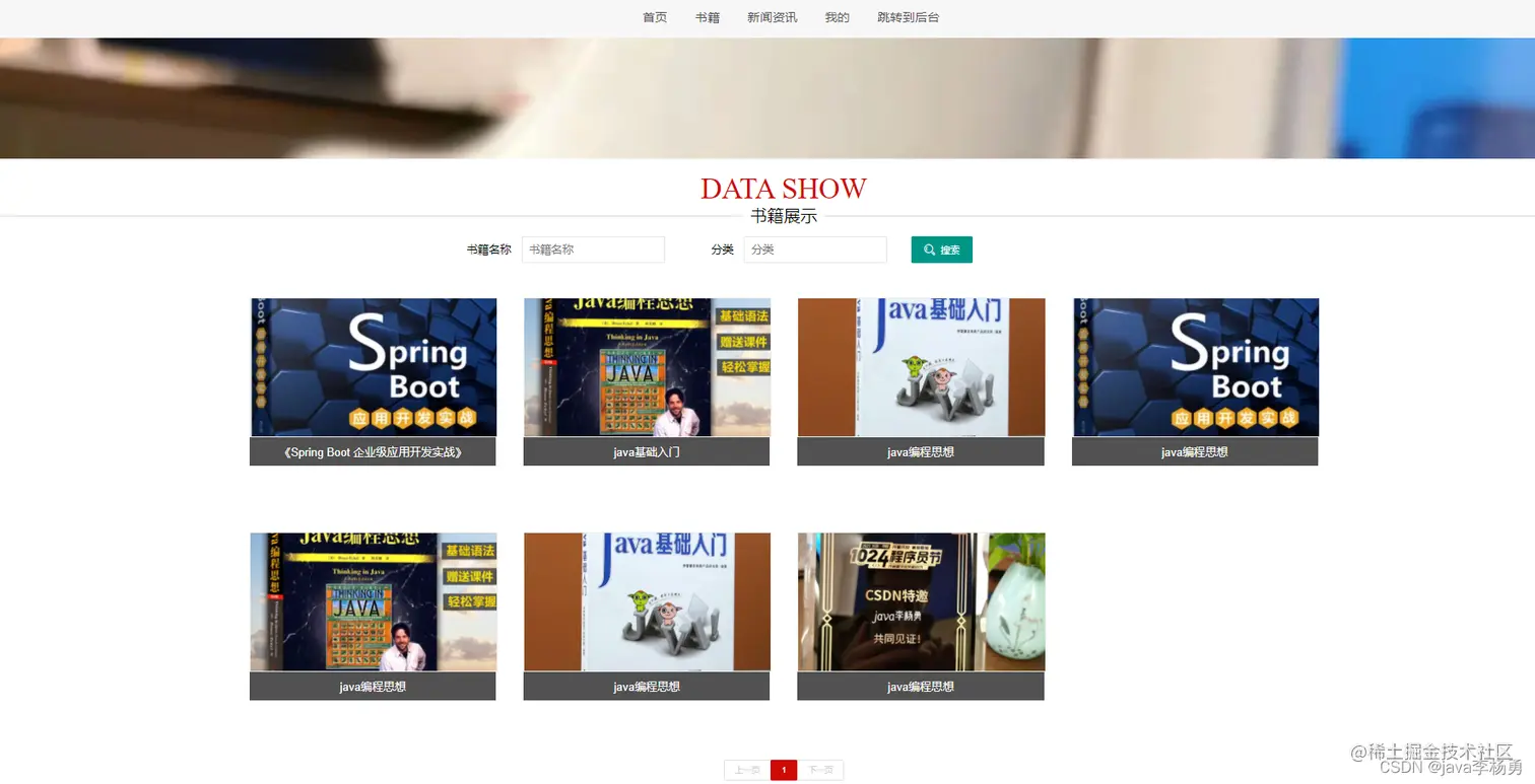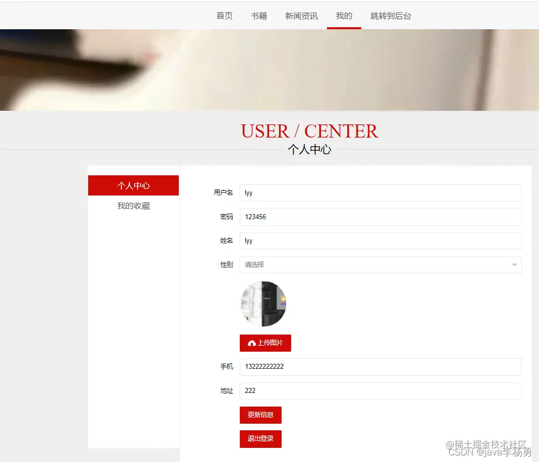 前端用户首页:用户登录后、可以查看新上架的书籍和新闻等书籍、点击进入详情查看购买书籍、加入购物车以及对自己感兴趣的图书书籍收藏等操作和查看修改个人信息等。