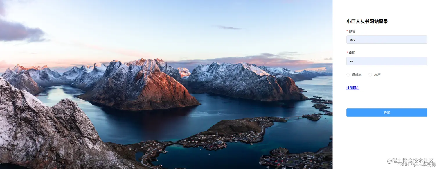 用户登录:分为管理员和普通用户进行登录、也可以在这里进行用户注册。