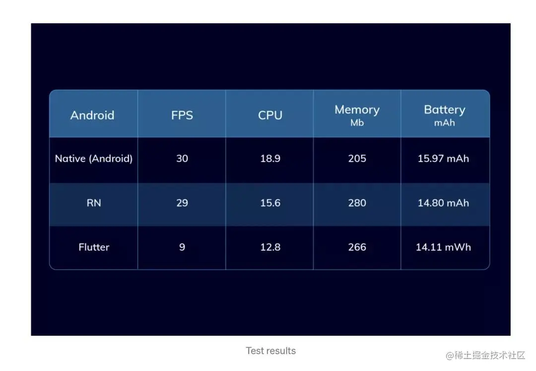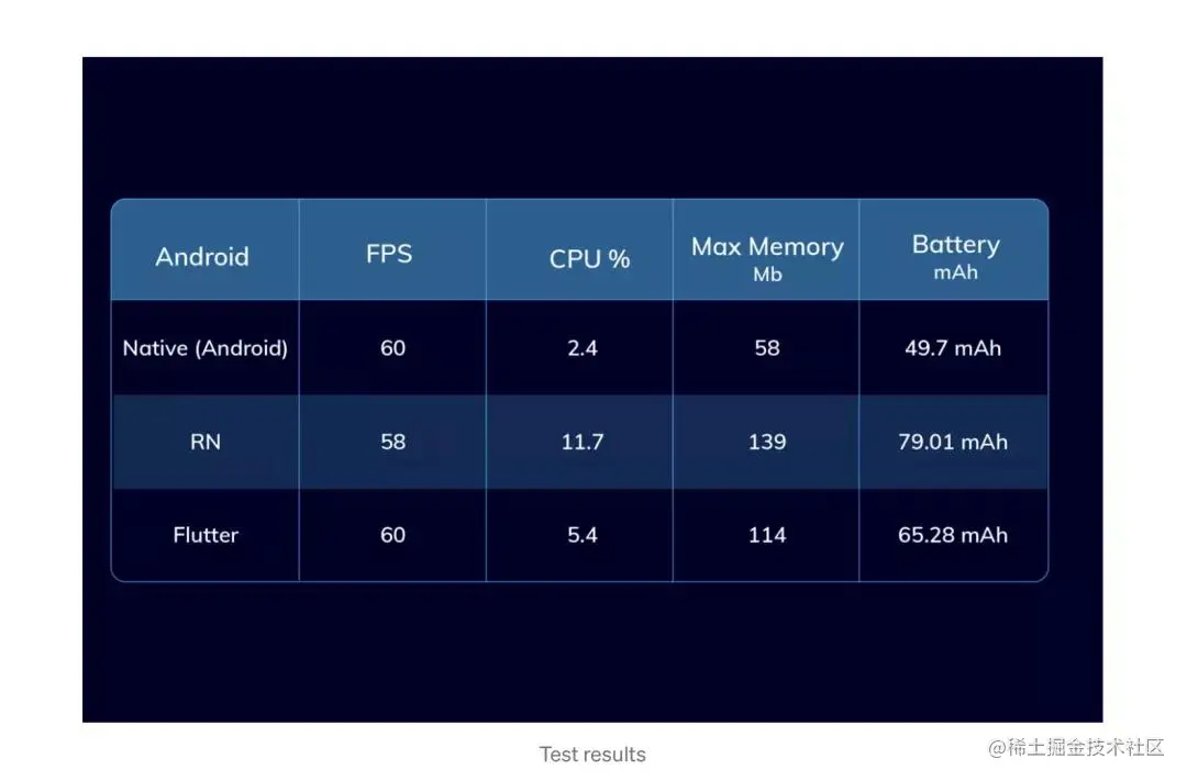 电量,Flutter 更优秀一些。电量跟 CPU 占用成正比,React Native 还是比较耗电的。