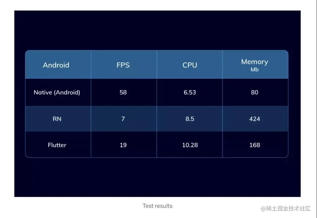 FPS, Native 是 58,Flutter 19,React Native 最差,只有 7。