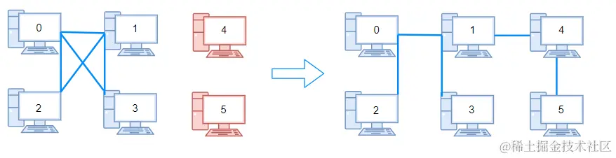 这道题是需要将电脑连接起来,所以这道题依旧是需要用到并查集问题,而题目给到的是N台电脑和有限个网线,我们知道如果需要将N台电脑连接起来,那么至少需要N-1根网线,所以,如果现有网线数少于N-1根那么一定无法将其全部链接。现在我们需要将已经链接起来的电脑都保存在一个集合中,然后查看所有电脑一共存在于几个集合中,然后将其都存在一个集合中,将M个集合变成一个集合,需要移动至少M-1根。