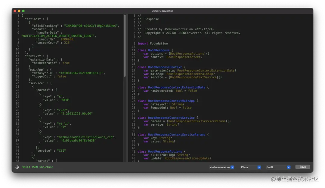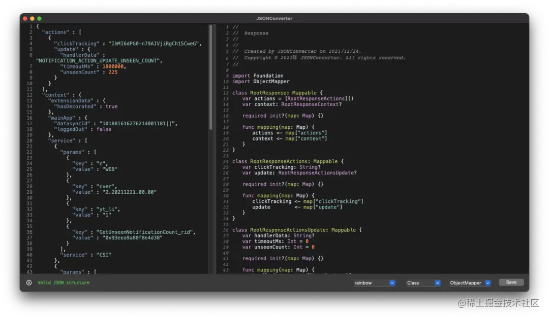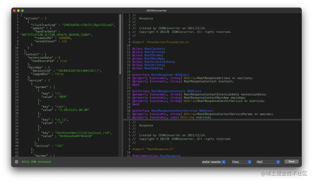 JSONConverter 是 MAC 上 iOS / Flutter / Android / Server 等开发的辅助工具,可以快速的格式化 JSON 数据并转换生成对应的模型类属性。