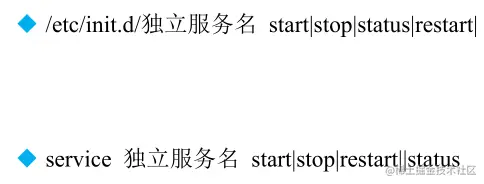 第二种命令是第一种命令的简化形式。这是红帽专有命令。service 会去 rpm 包默认的安装位置去找可执行文件,所以service类似的启动服务管理命令只能管理rpm安装包。如果更改了rpm包的默认安装位置,可能造成通过service启动服务失败。