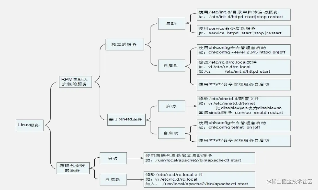 我们可以看到Linux的服务分为 RPM包安装的服务以及源码包安装的服务,而RPM包服务又分为独立服务和基于 xinetd 服务。本篇博客就分别介绍着三种服务的启动和如何自启动。