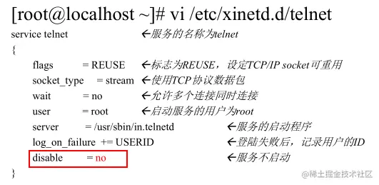 这个服务也是属于 RPM包,现在Linux系统中基于 xinetd 服务越来越少了,启动服务我们只需要修改 /etc/xinetd.d/服务名 这个文件的 disable = no 即可