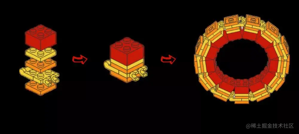 这很像乐高积木的搭建原理。用乐高积木拼装一个圆环,如果采用第一代 SDK,需要在一大堆形形色色的积木中找出如图所示第一代的 5 种规格,共 65 个积木用于搭建。