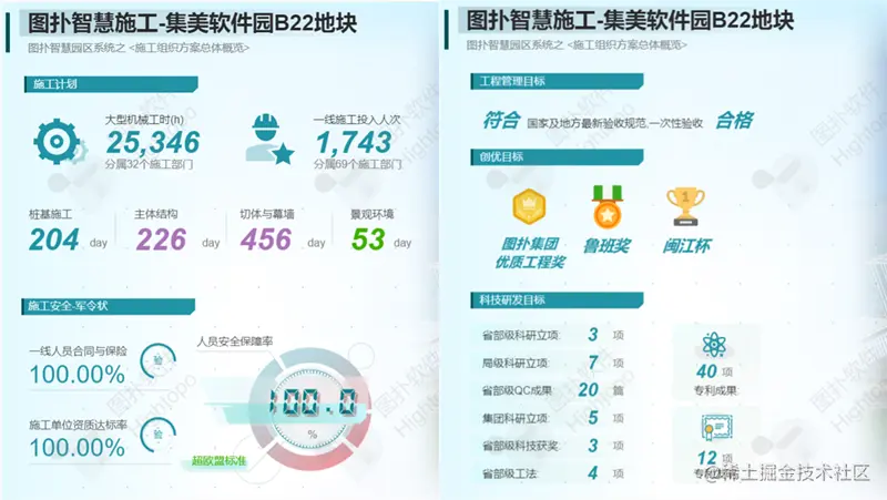 HT 左侧面板循环播放项目信息,包括施工时间与投入人员计划、施工人员安全情况、工程管理目标、创优目标以及科技研发目标。